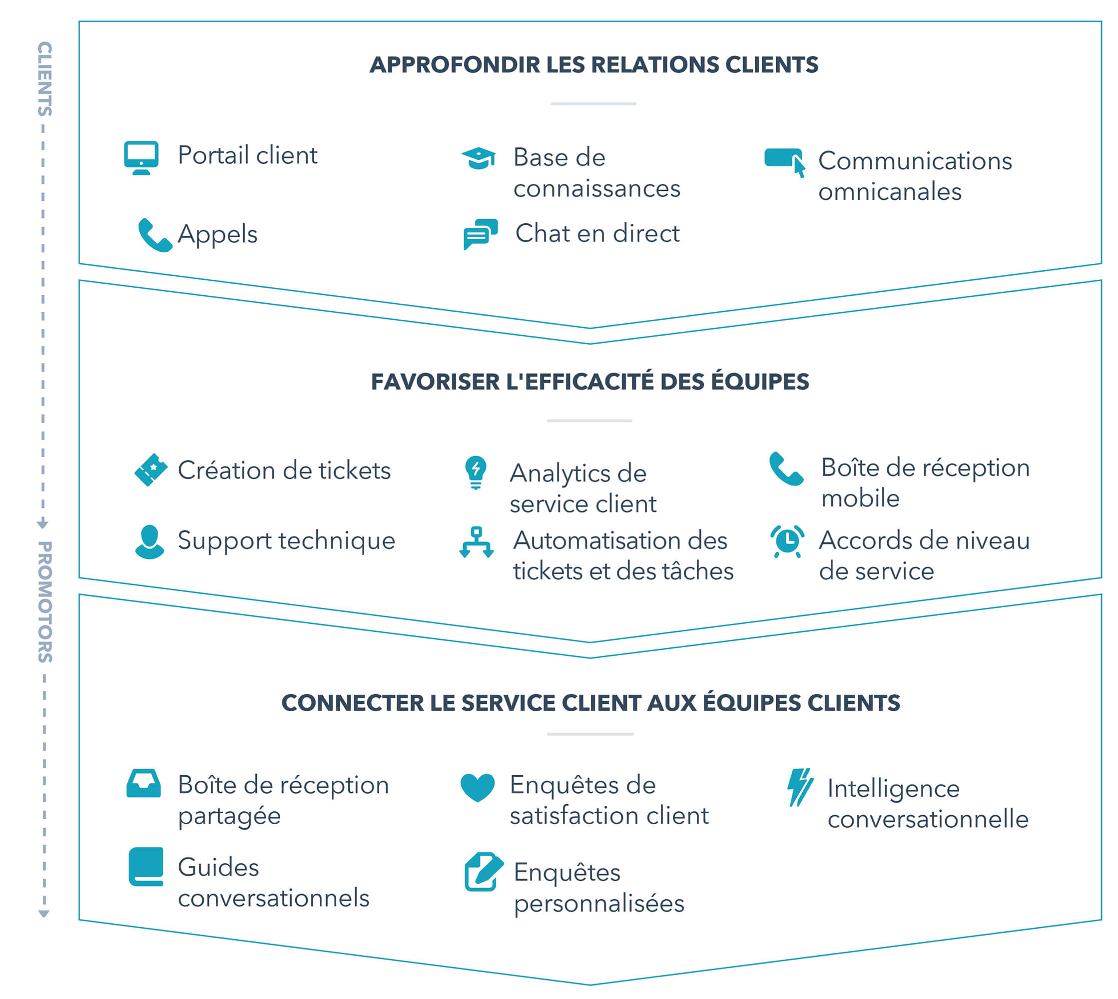 Le Service Hub se distingue non seulement par sa puissance et sa facilité d'utilisation, mais également par ses fonctionnalités permettant de prioriser les clients grâce aux différents canaux disponibles pour leur répondre où et quand ils le souhaitent. Le Service Hub vous aide ainsi à contextualiser et à personnaliser les interactions avec vos clients à chaque étape de leur parcours d'achat. De plus, le Service Hub incluant les fonctionnalités de CRM de HubSpot et bénéficiant d'une intégration parfaite avec le Marketing Hub, le Sales Hub, le CMS Hub et le Operations Hub, votre équipe bénéficie d'une vue complète de chaque client. Enfin, vous pouvez facilement synchroniser le Service Hub avec plus de 1 090 intégrations personnalisées, de Jira à SurveyMonkey en passant par Facebook Messenger, afin que votre équipe de service client rassemble ses outils de prédilection sur une seule plateforme puissante et facile à utiliser.