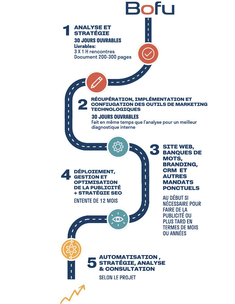 BOFU signifie bottom of the funnel et fait référence à la partie la plus importante de l’entonnoir de vente, là où vos clients potentiels sont prêts à convertir — acheter vos produits, prendre un rendez-vous, demander une soumission, etc. Nos solutions mettent l’accent sur l’optimisation de cette étape de vente, afin que vous puissiez obtenir un retour sur investissement concret, rapide, mesuré et quantifié.